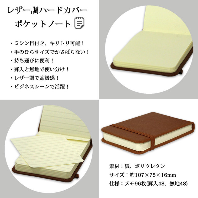携帯に便利なハードカバー製のポケットノートです。ワイシャツやスーツの胸ポケットにすっぽり収まる大きさです。多少乱暴に扱ってもハードカバーなので形が崩れることがありません。広がらないよう留め具(ゴムバンド)がありますので、不意に開いたりせず、プライバシーを守ります。ミシン目付きでキリトリ可能な嬉しい仕様。ちょっとしたメモに最適なノートです。
