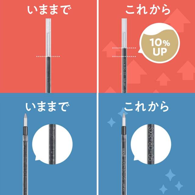 超・低摩擦ジェットストリームインク。従来品から、パッケージを紙パッケージに変更してエコに。さらにインク容量が、10%アップしております。