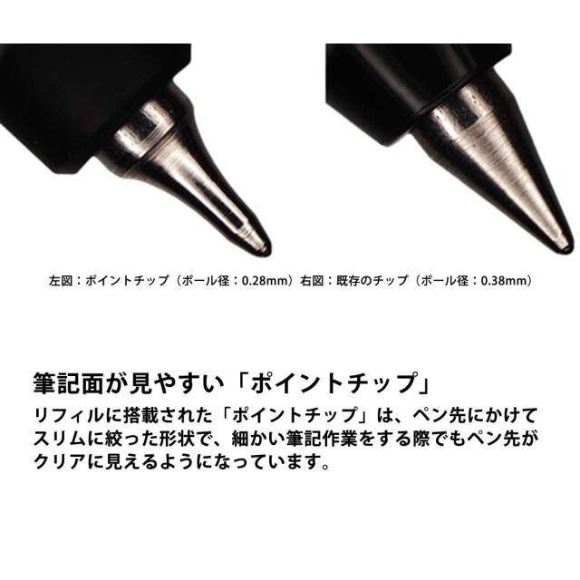 ジェットストリームエッジ SXN-1003シリーズの替芯です。リフィルに搭載された「ポイントチップ」は、ペン先にかけてスリムに絞った形状で、細かい筆記作業をする際でもペン先がクリアに見えるようになっています。