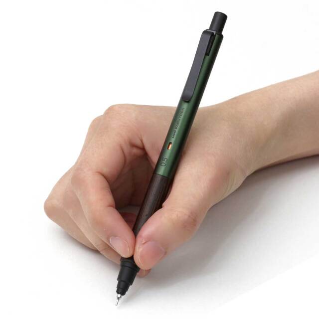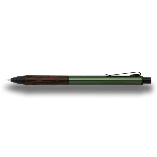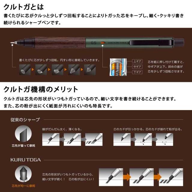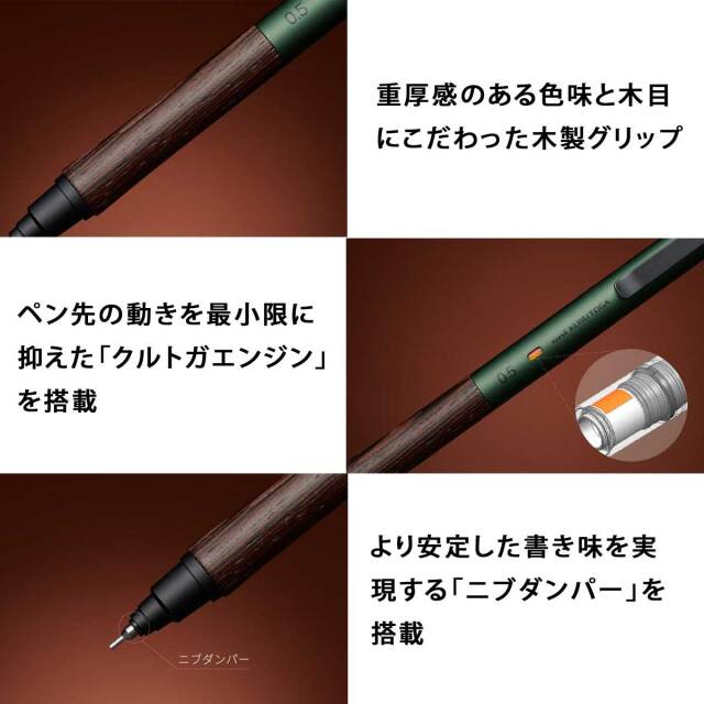 学生さんを中心に絶大な人気を誇る「クルトガ」。書くたびに芯がクルっと少しずつ回転することによりトガった芯をキープし、細く・クッキリ書き続けられるシャープペンです。クルトガは芯先の形状がいつもトガっているので、細い文字を書き続けることができます。また、芯の粉が出にくく紙面が汚れにくいのも特長です。グリップ部分には重厚感のある色味と木目にこだわり、「ウェンジュ」という樹種を採用。表面加工と軸色にこだわったアルミ製の後軸と組み合わせることで、より一層の上質さと天然木の味わいを表現。安定した筆記感に加え、唯一無二の木の温もりと精巧なメタルボディが調和したモデル。