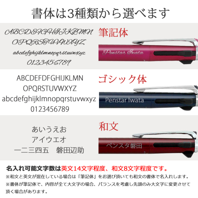 和文と英文が混在している場合は「筆記体」をお選びいただいても、和文の書体(ゴシック体)での名入れになります。