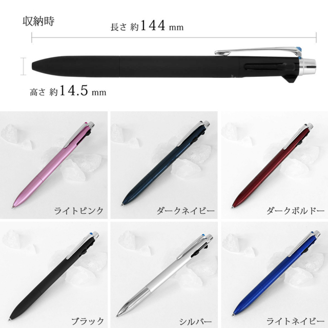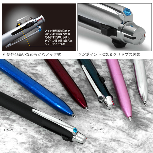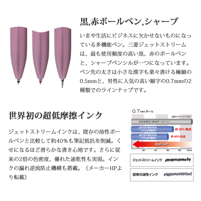 黒・赤のボールペンとシャープペンが搭載された3機能タイプ。ボールペン先は小さな漢字もきれいに書ける極細の0.5mmと男性に人気の高い細字の0.7mmの2種類。初期搭載された替芯はカラーによって異なります。黒・赤の2色のインクはそれぞれ超・低摩擦ジェットストリームインクが採用されています。筆記荷重・速度に関わらず抵抗が少なく滑らかに筆記することができ、インクの出過ぎを抑制する工夫もとられています。