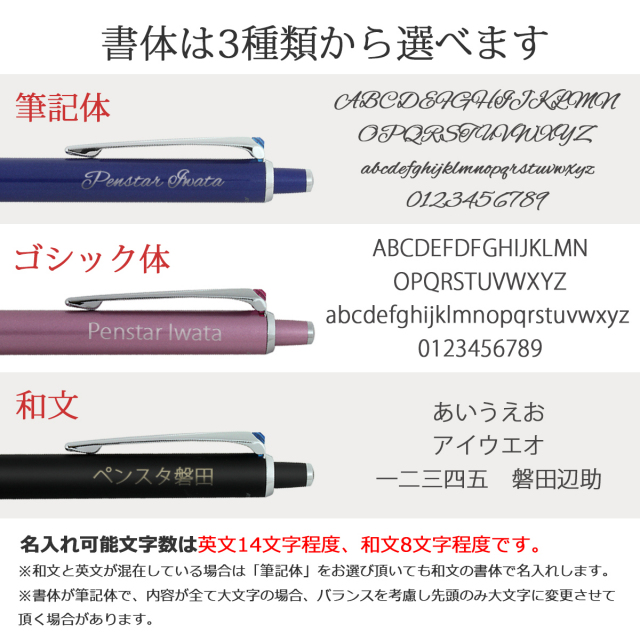 和文と英文が混在している場合は「筆記体」をお選びいただいても、和文の書体(ゴシック体)での名入れになります。