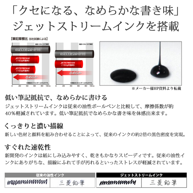 搭載されたレフィルはもちろん「ジェットストリームインク」。超・低摩擦でクセになる、なめらかな書き味です。替芯はお求めやすい価格なのも嬉しいポイント。日常使い出来る自分用でも、ボールペンをたくさん使う人のプレゼントとしてもおすすめです。