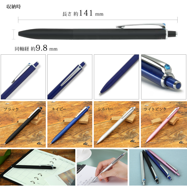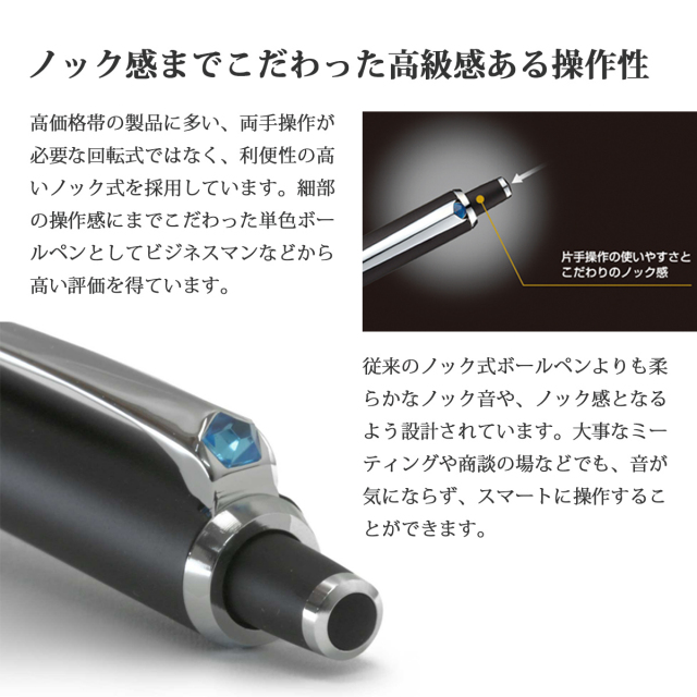 高級ボールペンの代名詞とも言える回転式はおしゃれだけど、急いでいる時や電話中などには不便に感じる事も。両手操作が必要な回転式ではなく、利便性の高いノック式を採用しているので、ボールペンをヘビーユーズする方には嬉しいポイントです。また、ノック感にまでこだわった高級感ある操作性を実現。従来のノック式より音が静か。確かな押し心地の感触は感じるのに、バネの音が静かなので、大事なミーティングや商談の場などでも音を気にせず使えます。
