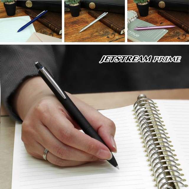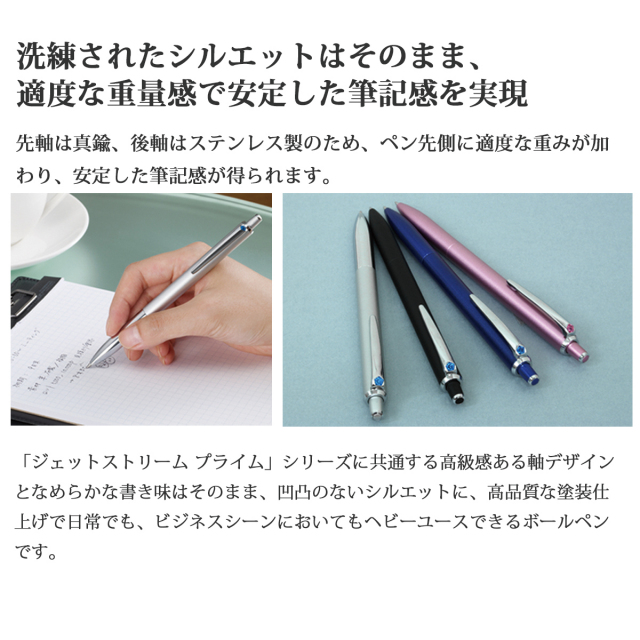 先軸は真鍮、後軸はステンレス製を使用しペン先に適度な重みを加えることで安定した筆記感が得られます。『ジェットストリーム プライムシリーズ』に共通する、なめらかさを表現する凹凸のないシルエットに、高品質な塗装で仕上げられています。