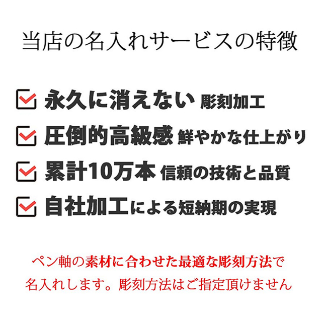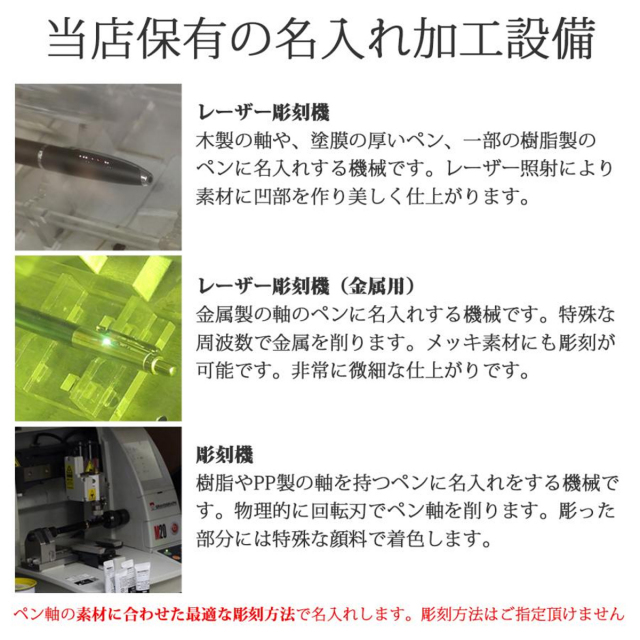当店は創業以来、累計で10万本を超える筆記具に名入れをしてきました。当店自慢の設備(レーザー彫刻機、金属レーザー彫刻機、機械彫刻機)で、1,500種類以上のボールペン、万年筆に名入れが出来ます。