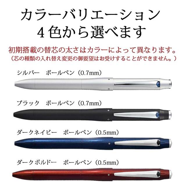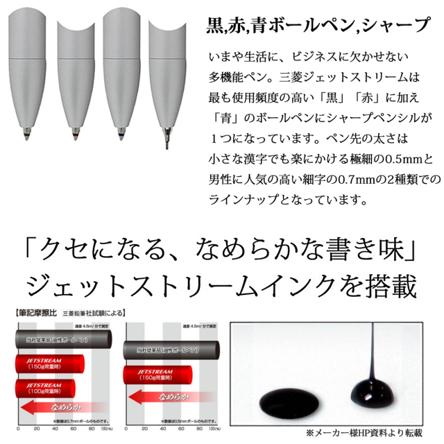 搭載レフィルはもちろん「ジェットストリームインク」。ボールペン先は小さな漢字もきれいに書ける極細の0.5mmと男性に人気の高い細字の0.7mmの2種類。初期搭載された替芯はカラーによって異なります。黒・赤の2色のインクはそれぞれ超・低摩擦ジェットストリームインクが採用されています。筆記荷重・速度に関わらず抵抗が少なく滑らかに筆記することができ、インクの出過ぎを抑制する工夫もとられています。