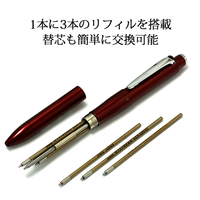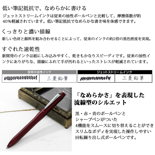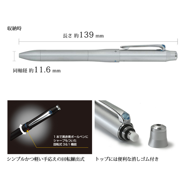 ノック式の多い三菱のボールペンの最上位モデルとして、「回転繰り出し機構3&1」を搭載し、黒・赤・青のボールペンとシャープペンのついた4機能タイプでありながら、スリムなボディを実現しています。軸は両方向への回転が可能で、4機能をスムースに切替えることが出来ます。