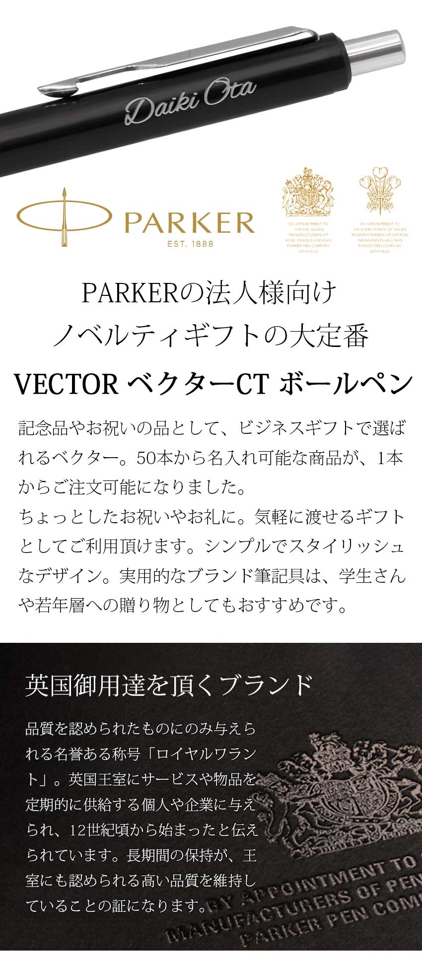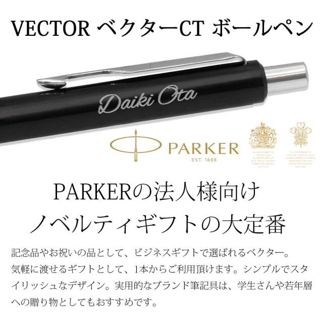 PARKERの企業向けノベルティギフトとして定番のVECTOR(ベクター)CTボールペン。記念品やお祝いの品として50本から名入れ可能な商品が、1本からご注文可能になりました。ちょっとしたお祝いやお礼に。気軽に渡せるギフトとしてご利用頂けます。