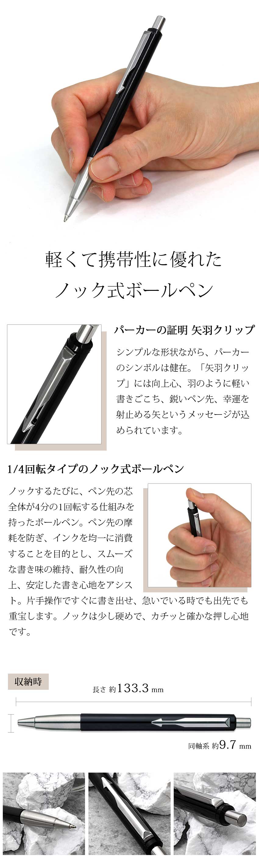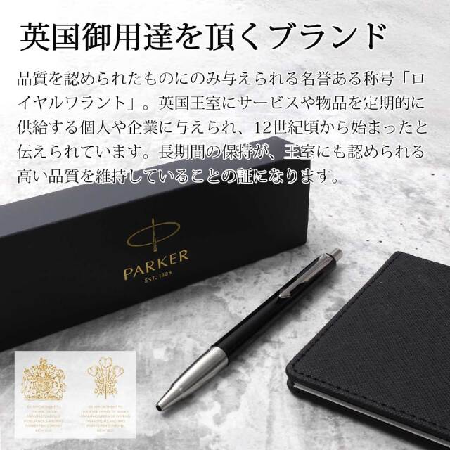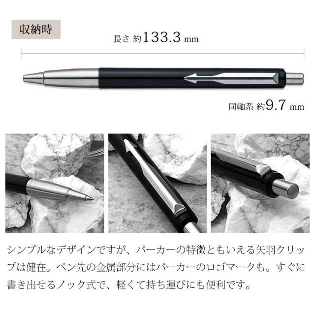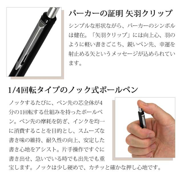 シンプルなデザインですが、パーカーの特徴ともいえる矢羽クリップは健在。ペン先の金属部分にはパーカーのロゴマークも。1/4回転タイプのノック式を採用するなど、実用面でも使いやすい、学生さんや若年層への贈り物としておすすめのブランド筆記具です。