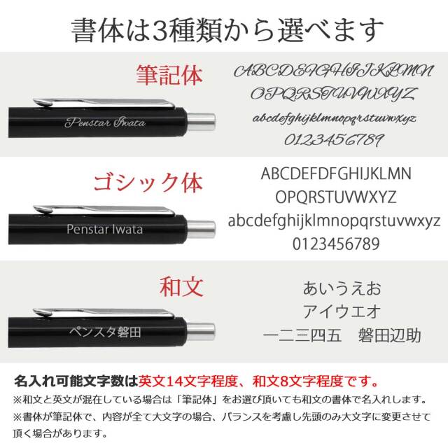 和文と英文が混在している場合は「筆記体」をお選びいただいても、和文の書体(ゴシック体)での名入れになります。