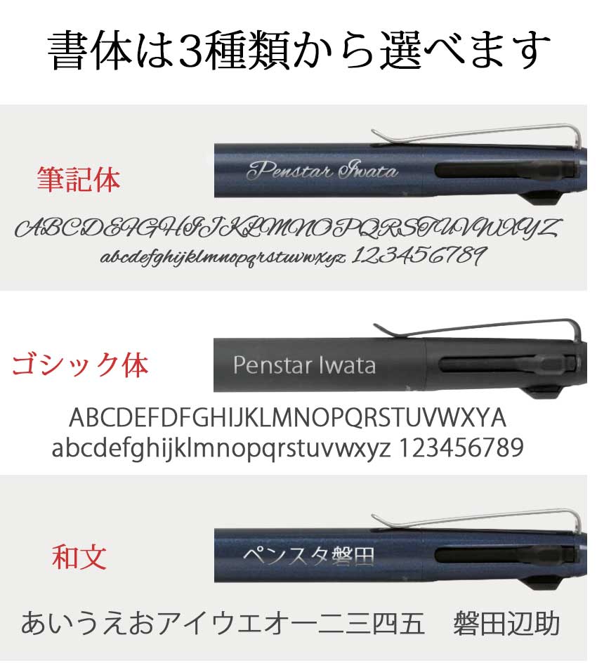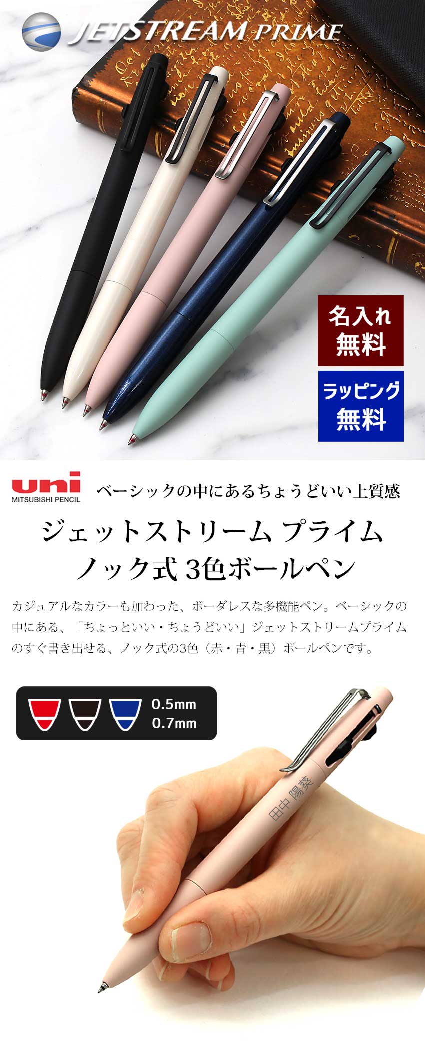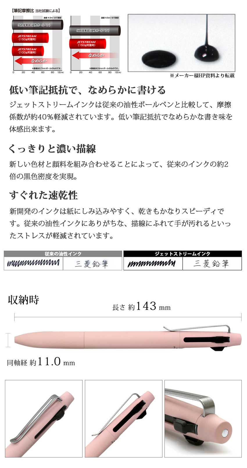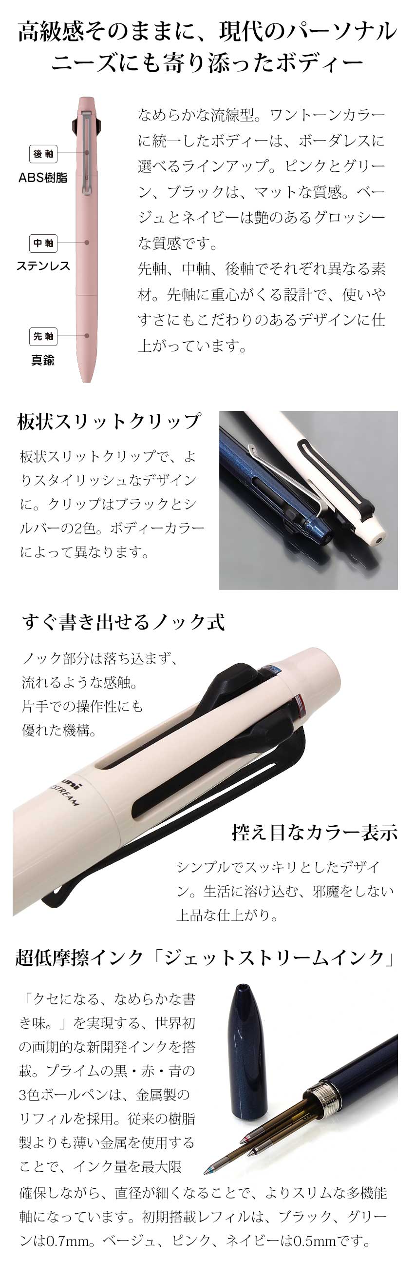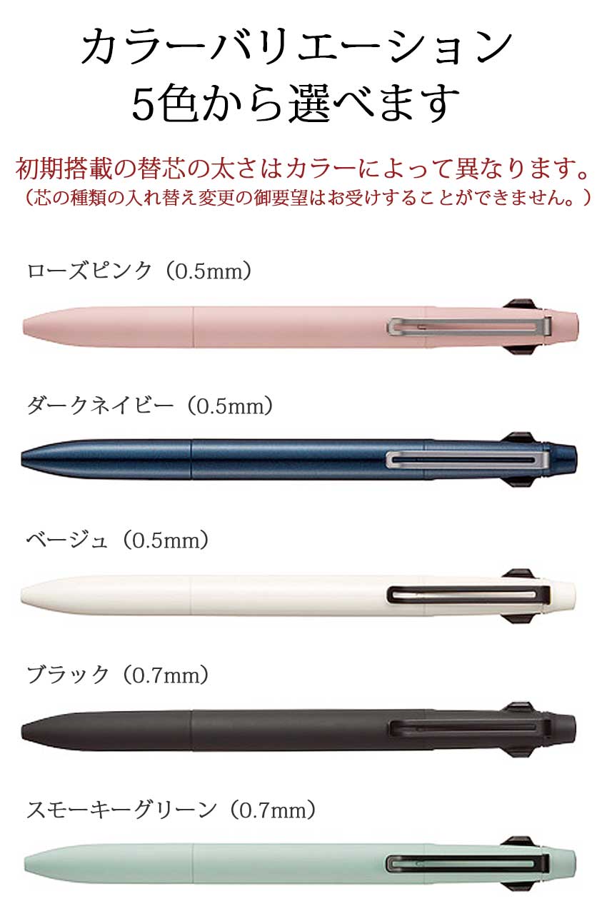 黒・赤・青のボールペンが搭載された3機能タイプ。ボールペン先は小さな漢字もきれいに書ける極細の0.5mmと男性に人気の高い細字の0.7mmの2種類。初期搭載された替芯はカラーによって異なります。インクはそれぞれ超・低摩擦ジェットストリームインクが採用されています。筆記荷重・速度に関わらず抵抗が少なく滑らかに筆記することができ、インクの出過ぎを抑制する工夫もとられています。