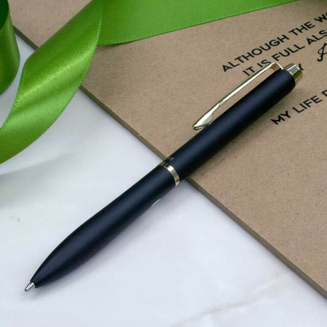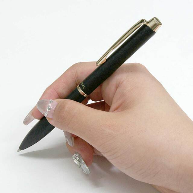 滑らかな筆記と掠れがない書き出しが特徴の油性インキ「アクロインキ」をイメージした流れるような形状のボールペンです。