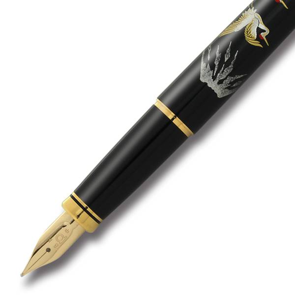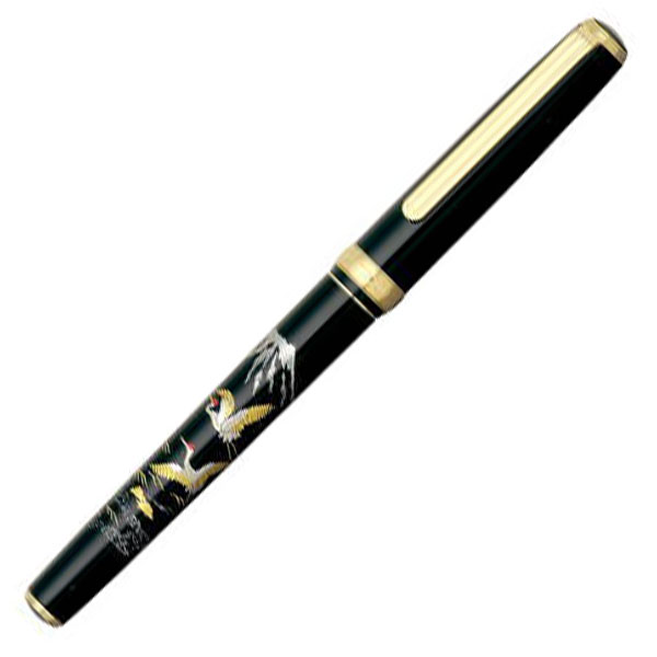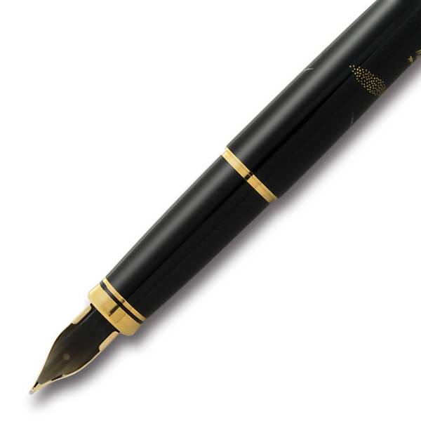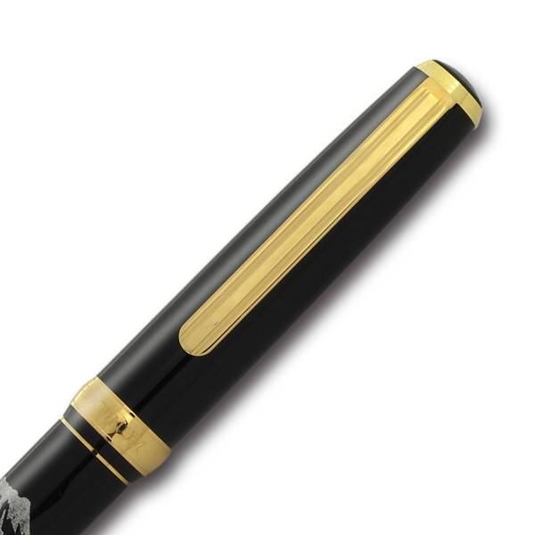 日本の伝統工芸「蒔絵」と呼ばれる技法で金や銀粉を蒔いた手作りの逸品。表面に漆でデザインを描き、それが乾かないうちに金や銀などの金属粉を「蒔く」ことで定着させる技法。豪華で美しい仕上がりが特徴で、その綺羅びやかな仕上がりに目を奪われます。正統派の標準的なボディに18金のペン先を採用。18金のペン先は弾力性が強く書けば書くほど手に馴染んで使いやすくなります。