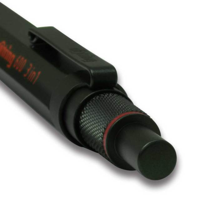 1980年台に誕生したロットリングを代表するモデル。600シリーズに、ボールペン黒・赤の0.5mmメカニカルペンシルの3機能を搭載したマルチペン。赤いリングの下のローレット加工部分を回転するとペン先の出し入れが出来ます。ロットリングを象徴する六角形の形状とフルメタルボディがプロフェッショナルな印象を与える1本です。